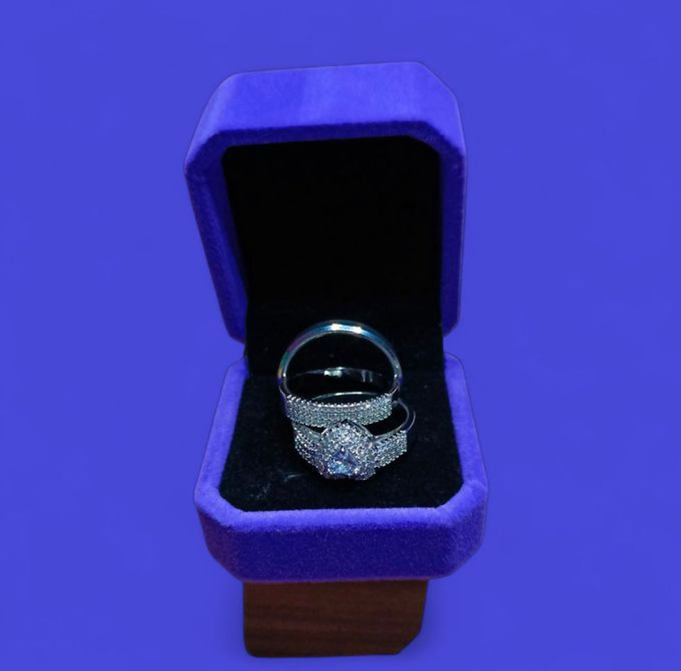 3-Piece Silver Heart Diamond Wedding Ring Set In Box